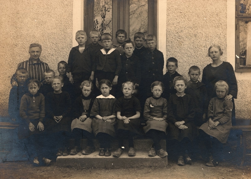 Titel: Skolklass, på trappa, 2 kvinnliga lärare 20 elever.