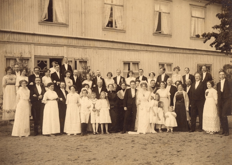 Bröllopsfoto, gruppbild 49 personer, i bakgrunden ett stort trähus foto: Palmérs atelier Vittsjö.