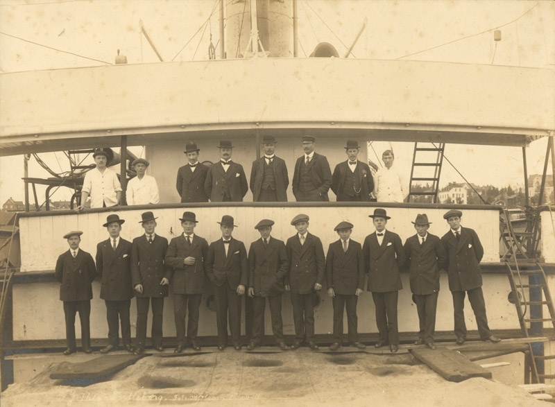 S/S Gothia, gruppfoto på däck, 19 personer, foto: Oskar W Olsson.