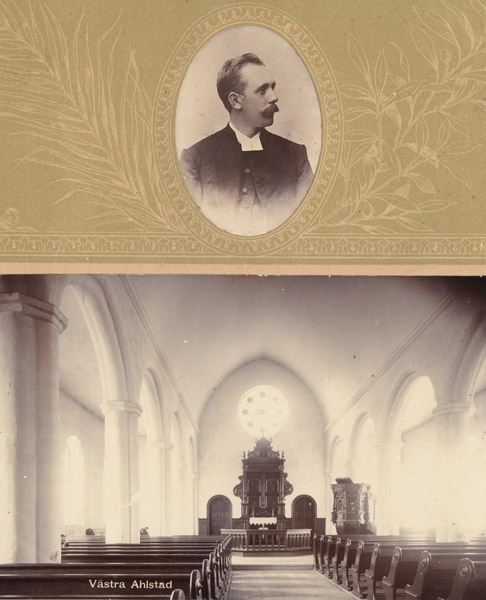 Västra Ahlstad kyrka, interiör, kyrkoherden och prästen Wilsson i Trollenäs, foto: B A Lindgrens förlag grönegatan 15 Lund, 9391, prosten Wilsson Trelleborg, han var prost i Alstad det året prästgården i Alstad brann. Genom kyrkoherde Wulffs dotter, fröken Boel Månsson Sjörup Alstad blev överkörd av tåget i Trollenäs?