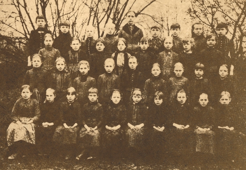 Fröken Ingrid Larssons skolklass 1890, foto Rudolf Pettersson Höganäs, översta raden från vänster Augusta Åkesson-Ringström.
