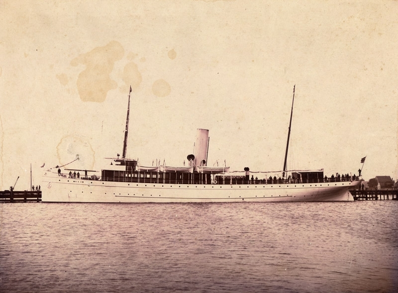 Postångaren REX vid mittbron 1890-talet, till höger Sticklers magasin, Ajgeldingers badhus, Carl Smiths veranda.