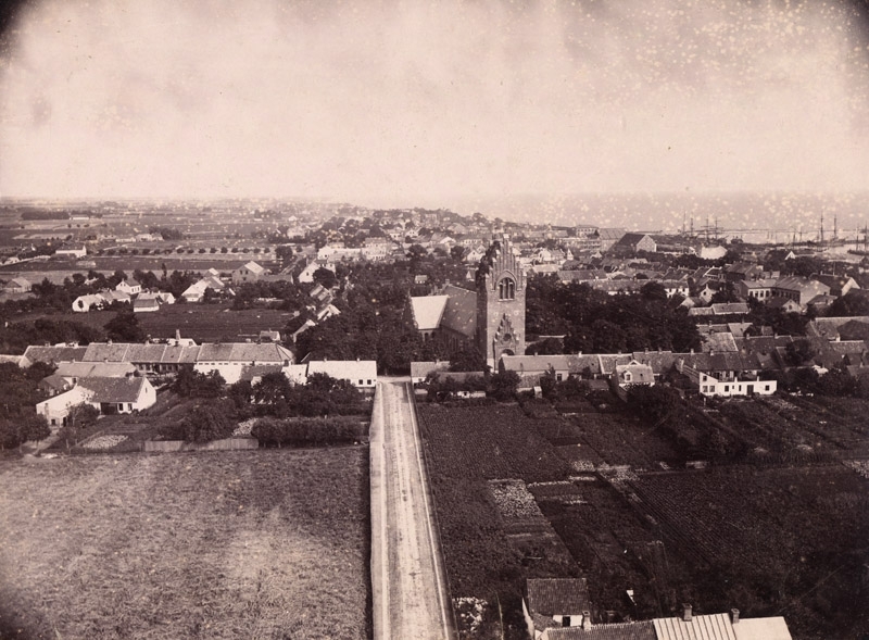 Vy av Trelleborg mot ost, tagen från sockerbruket, i förgrunden kålgårdar, till höger norr därom Gråbrödersgatan, mitt i bild syns Norregatan och Sankt Nicolaikyrka 1897.