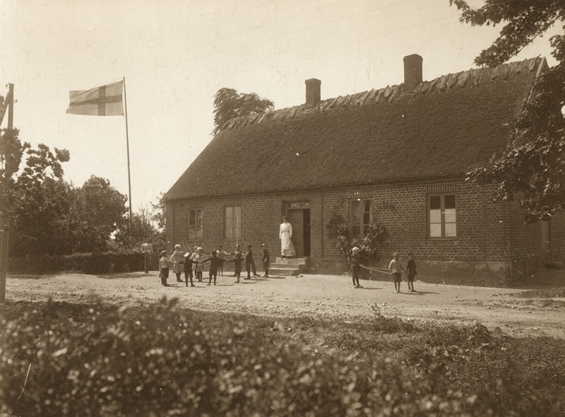 Markie skola med halmtak i Anderslöv, barnen leker framför skolan, 10536, foto: Bengtsson Trelleborg.