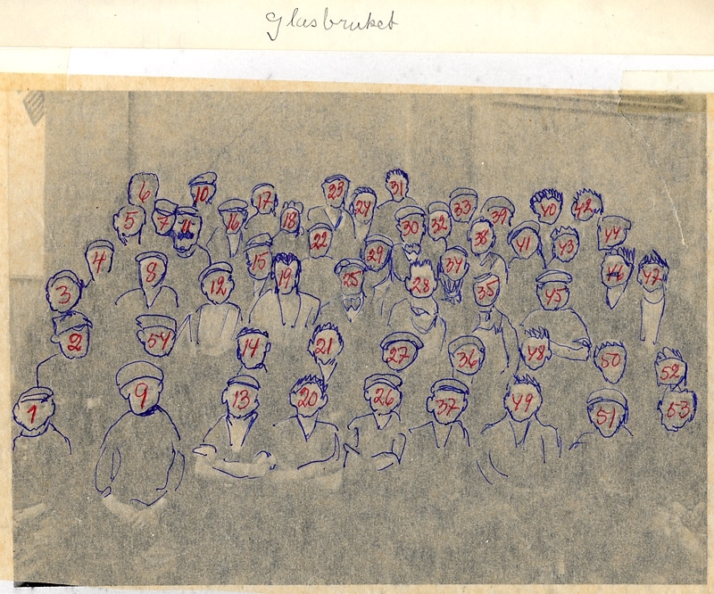 Glasbrukets personal på 20-talet, 1 Gunnar Fridh, 2 Thage Widén, 3 Ove Walldén, 4 Egon Persson, 5 Adolf Carlsson, 6 Frans Nilsson, 7 Erik Fridh, 8 Kari Leo, 9 Gustav Andrén, 10 Yngve Heintze, 11 Nils Nilsson, 12 Arvid Jonasson, 13 Nils Nilsson, 14 Arvid Theander, 15 Karl Simonsson, 16 Johan Hansson, 17 Thage Theander, 18 Erik Jönsson, 19 Ernst Persson, 20 Fredrik Persson, 21 Thage Persson, 22 Hans Lindvall, 23 Knut Persson, 24 Oskar Lundberg, 25 Sture Andersson, 26 Charles Olsson, 27 Thure Wallin, 28 Hilmer Nilsson, 29 John Johansson (smed), 30 Ivarsson, 31 Artur Jeppsson, 32 Einar Bruhn, 33 Erik Lingemo, 34 Sture Nilsson, 35 Kjell Simonsson, 36 okänd, 37 Henry Ring, 38 Gunnar Lindkvist, 39 Olof Ohlin, 40 Erik (Hamlet) Persson, 41 Ivar Gustafsson, 42 okänd, 43 Sten Johansson, 44 Arvid Persson, 45 Göte Wenell, 46 Frans Widén, 47 Birger Persson, 48 Gustaf Flint, 49 Åke Karlsson, 50 Gustav Jonasson, 51 Knut Liljeberg, 52 Erik Berggren, 53 Hans Holmgren, 54 Paul Lindahl