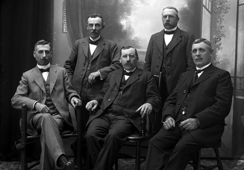 Fem stiliga herrar, tre sitande och två stående.