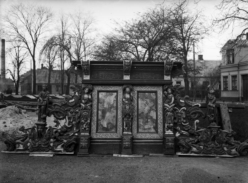 Del av stadskyrkans altartavla uppställd utomhus.