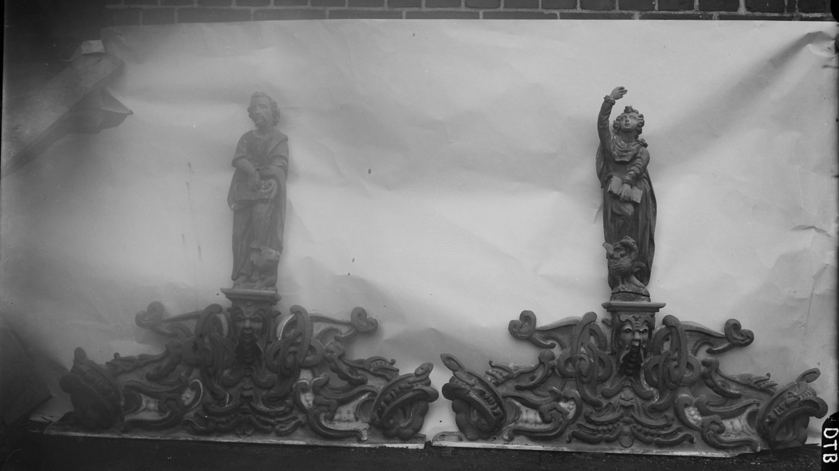 Trelleborgs kyrka, interiör. Två träskulptur från altartavlor.