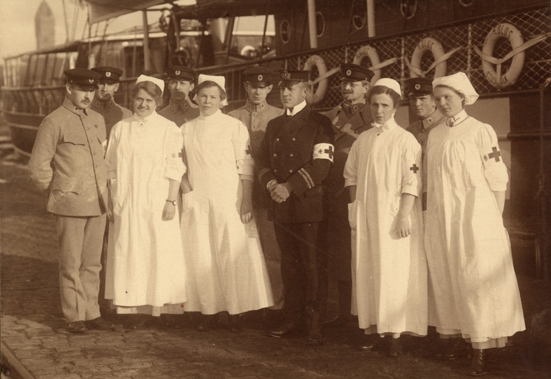 Gruppfoto av Röda Korsetpersonal, kvinnor och män, Dr. Hedenlundh framför. Fotot taget i samband med krigsfångeutväxlingen under första världskriget 1914-18.