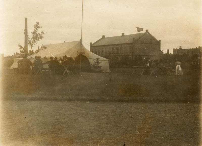Lantbruksmötet i Trelleborg 1904, tältservering, 3660, stadsparken, i bakgrunden Centralskolans äldsta byggnad, 70:2853.