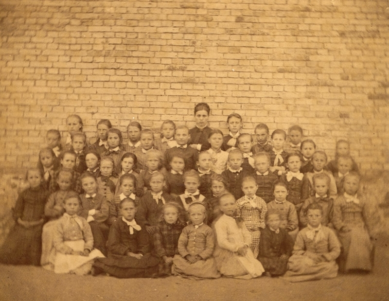 Centralskolan skolklass, folkskollärarinnan Ingrid Larsson, foto 1879.