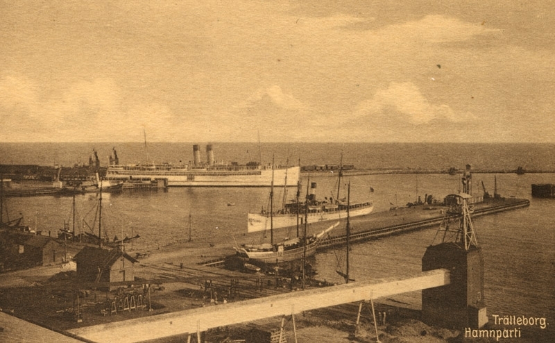 Hamnen i Trälleborg, foto från N. mot S. omkring 1912, 6850:1, i förgrunden Ångkvarnen remtransportör för säd, längst till vänster hamnvaktstuga tidigare hamnkaptens kontor, bredvid lotshus (med den vita flaggstången), i mitten en Sveaångare ligger till mittelbron, längre till höger det första plåtskjulet, i fonden en ångfärja i läget.