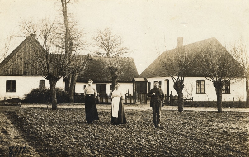 Lantgård med tre personer på åker framför gården, pilträd vid vägen framför gården, 8312.