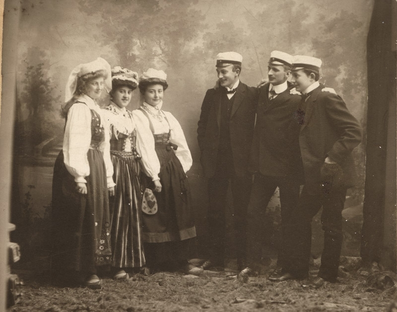 Tre flickor i folkdräkt, tre unga män i kostym och studentmössa, Engholms fröknar, döttrar till arrendatorn på Lilla Markie, Engholm (dansk) hade Stora Markie på arrende (Norén), 10352.