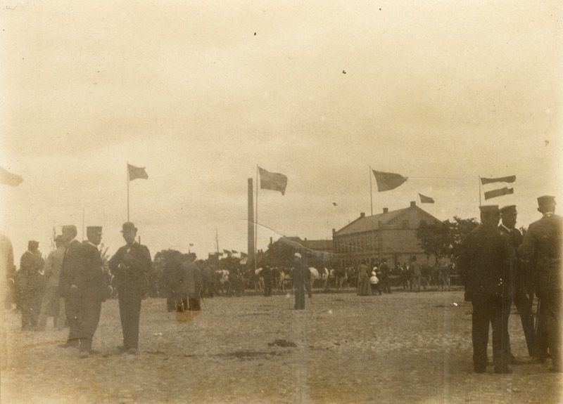 Lantbruksmötet stortorget i Trelleborg 1904, vy mot sydost centralskolan i bakgrunden, djuruppvisning, 70:2854, 3662.