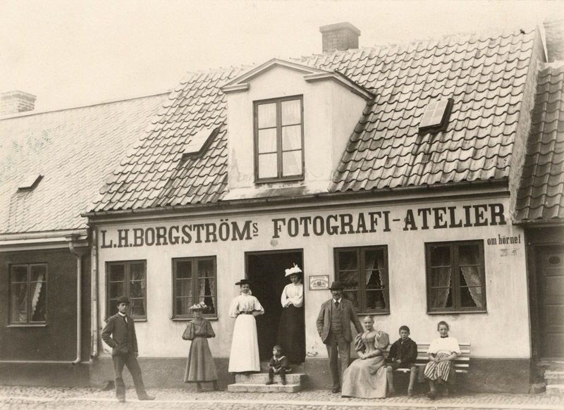 Fotograf L. H. Borgström med familj framför huset på Algatan i kvarteret Triangeln, 89:0964, negativ 70:987.