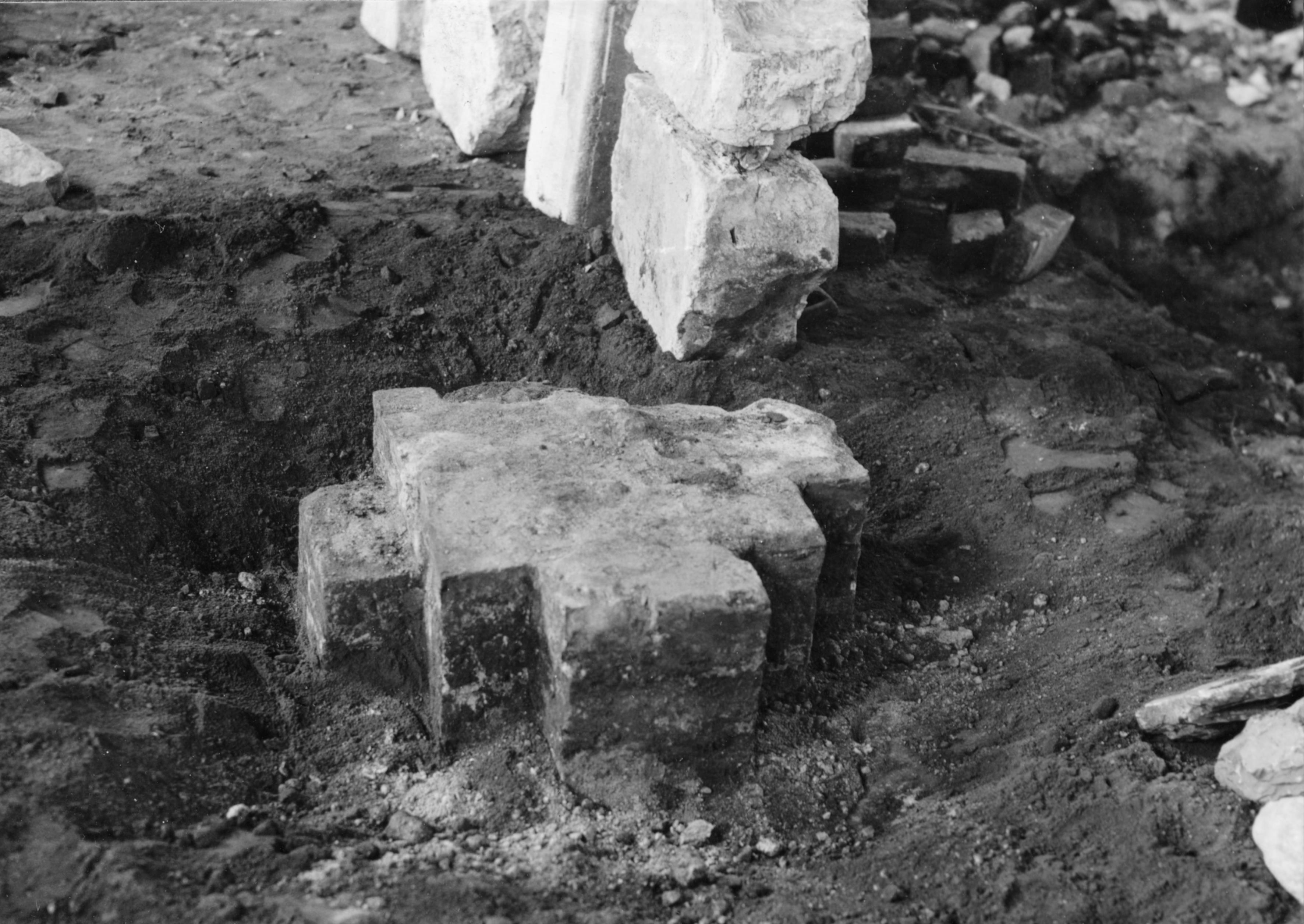 Det västligaste fundamentet till skeppets mittpelare. Båda fundamentena var uppförda i tegel. Foto åt väster.