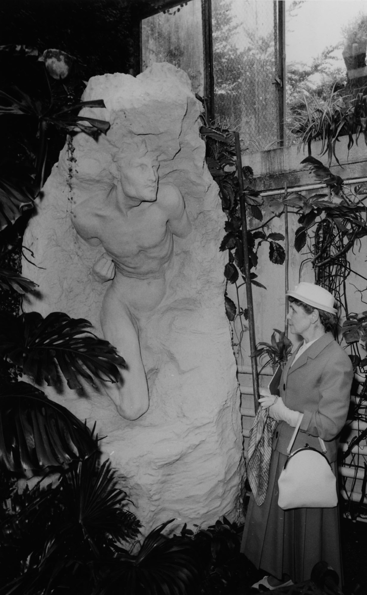 Lillemor Ebbe vid skulpturen Mannen som bryter sig ur klippan.