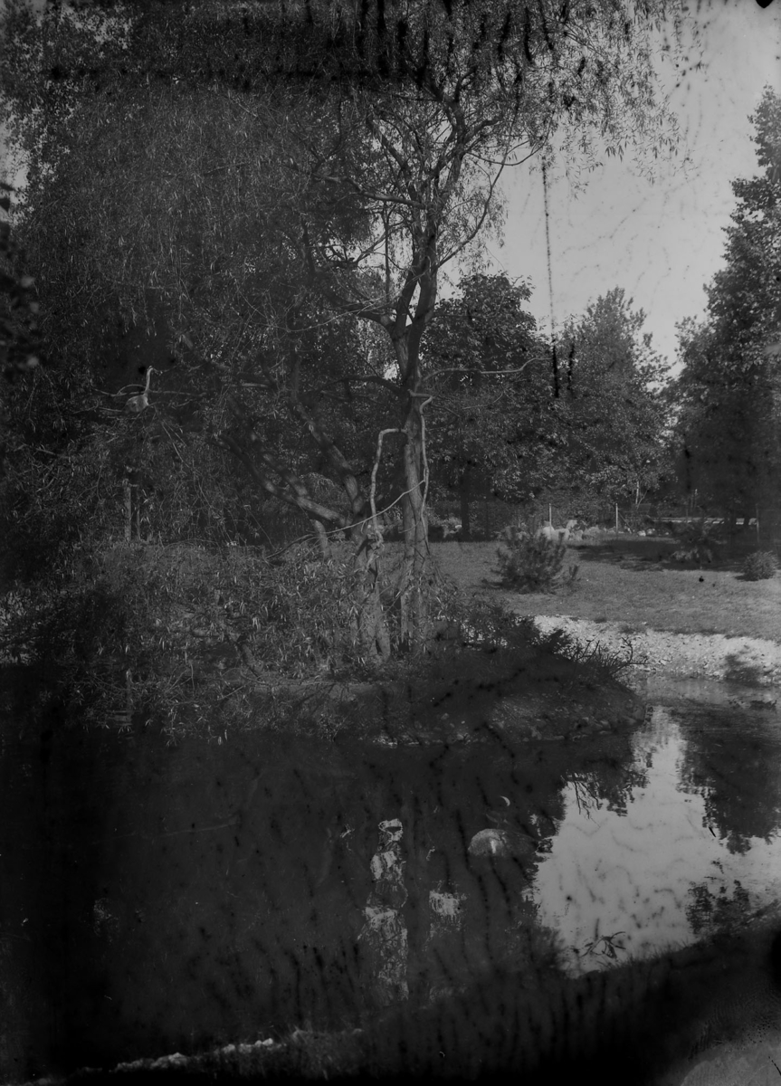 Titel: Stadsparken, en av dammarna med en ö i.