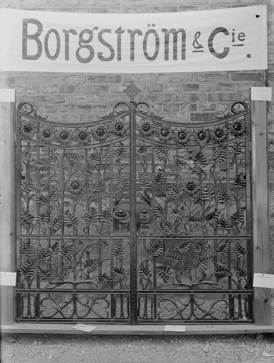 Borgström & Cie. Smidd grind med blommönster, grinden krönt av ett kors. Utställningsplåtar 1925