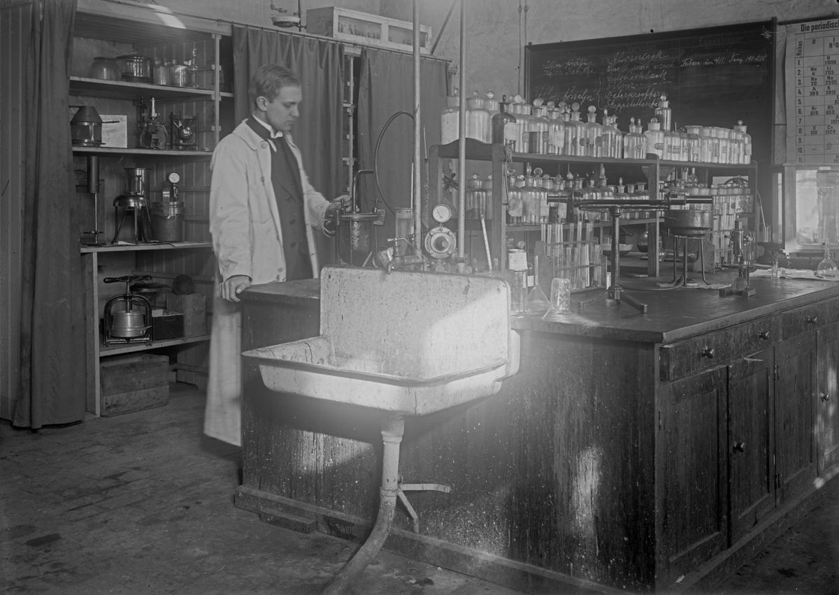 Färgfabriken Standard.Interiör, laboratorium, man i vit rock.
