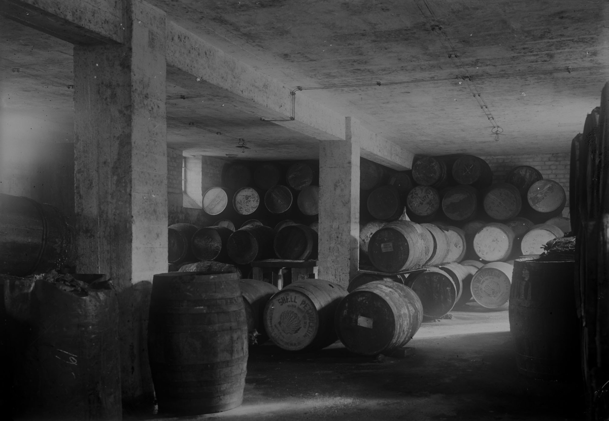 Titel: Färgfabriken Standard. Interiör, lager med tunnor.