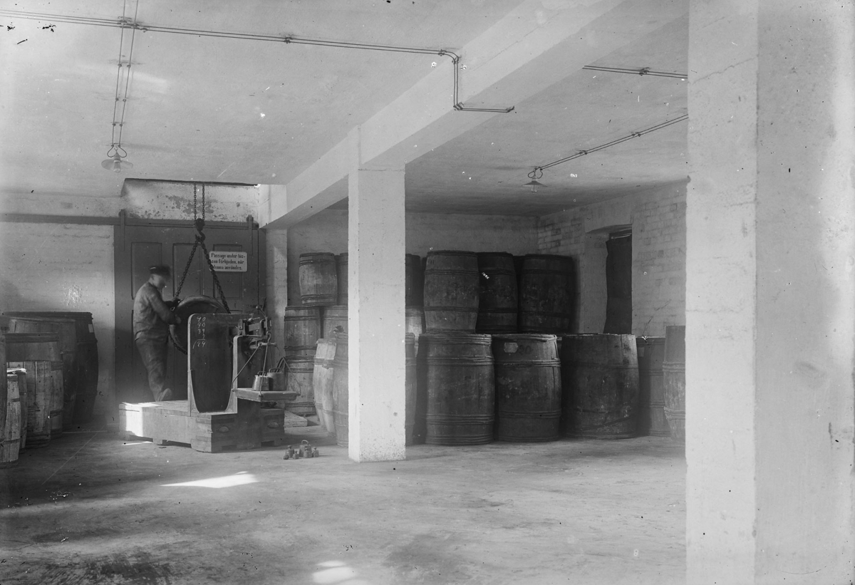 Färgfabriken Standard. Interiör. Lager lokal med tunnor, man vid travers eller liknande.