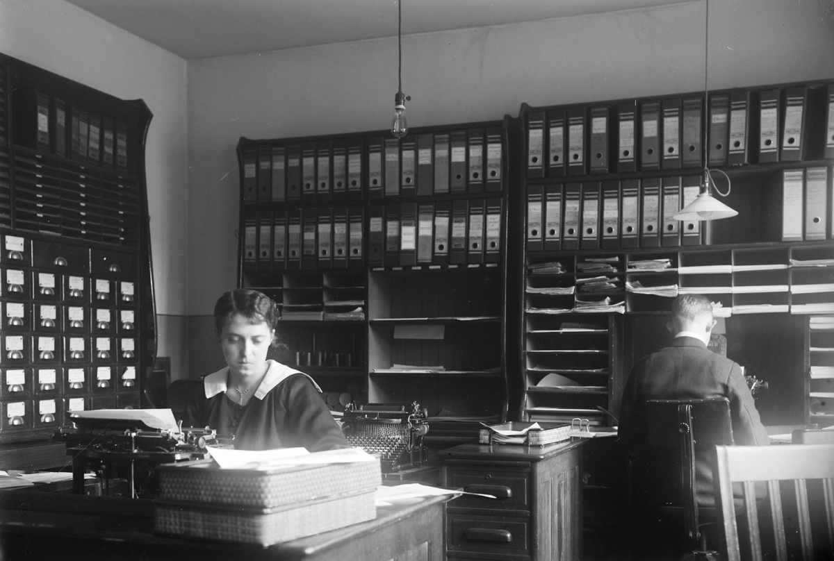 Färgfabriken Standard. Kontorslokal, man och kvinna vid skrivmaskiner.