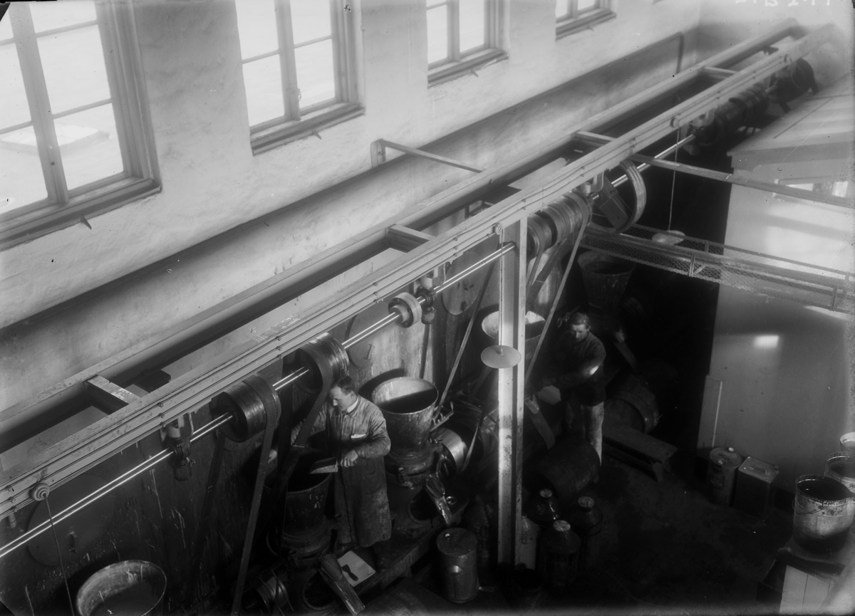 Titel: Färgfabriken Standard. Interiör,fabrikslokal. Två arbetare vid stora kärl.