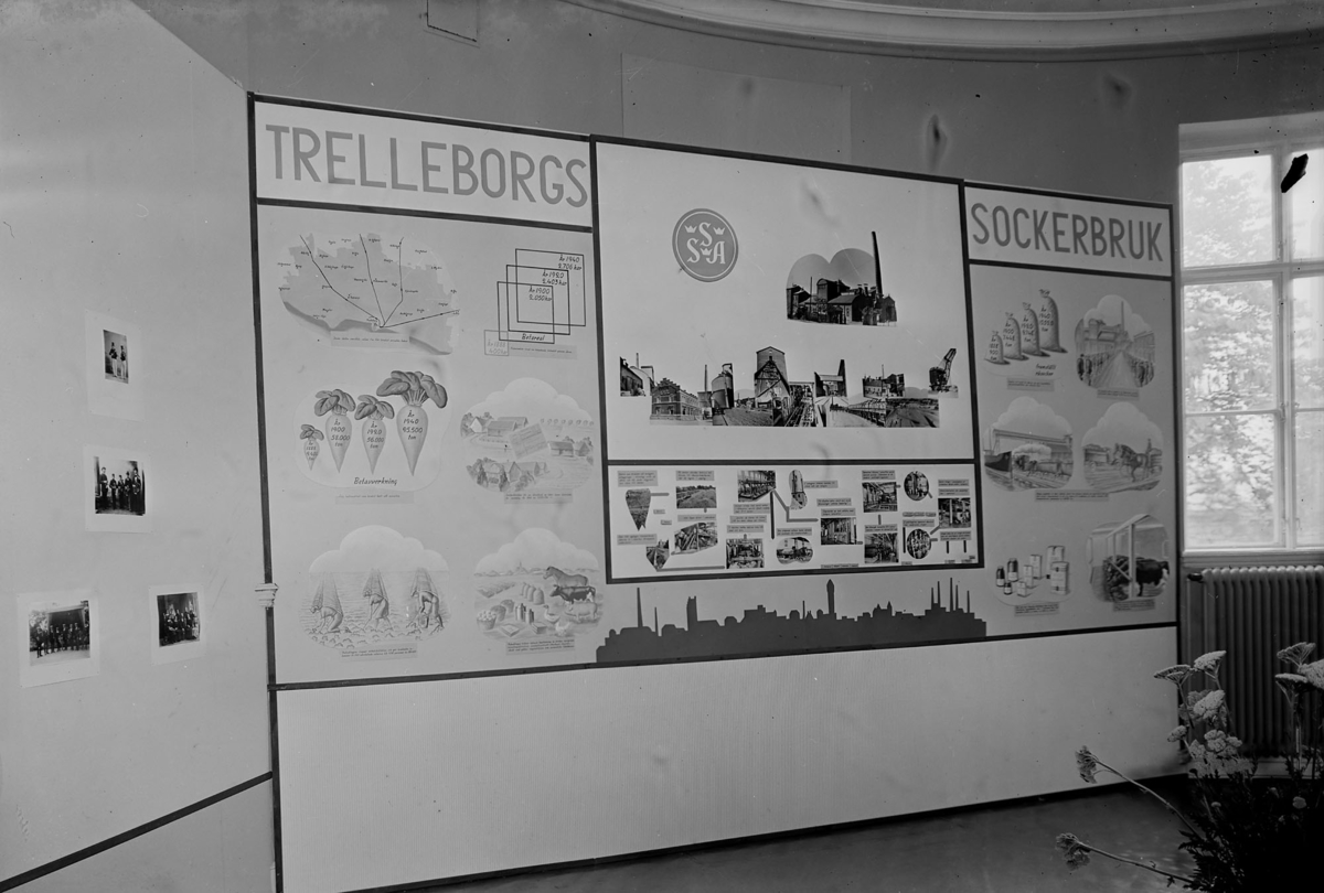 Trelleborg 75-årsjubileum 1942. Skyttsgården utställning. Skärm med fotografier och illustrationer.