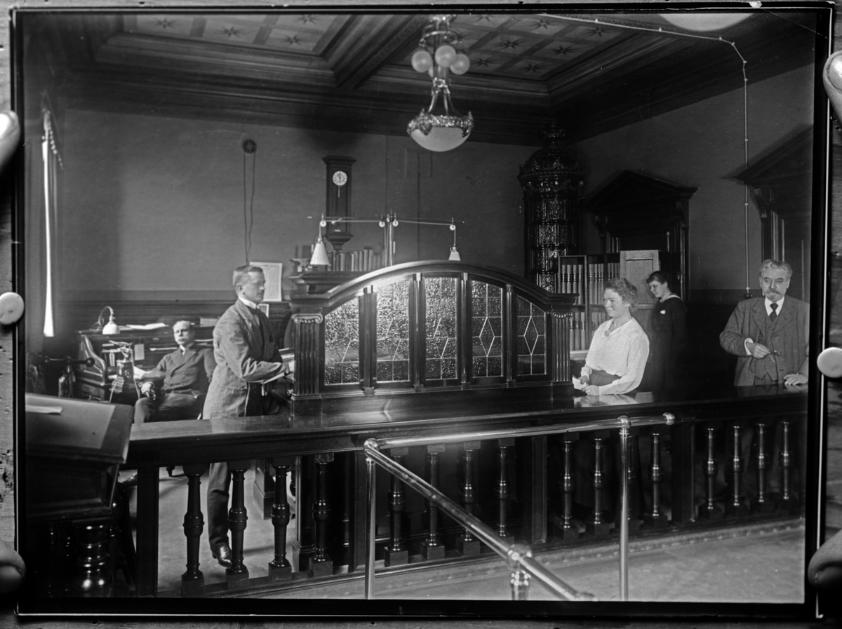 Stadsbanken. Repro av bankinteriör med fyra ur personalen.