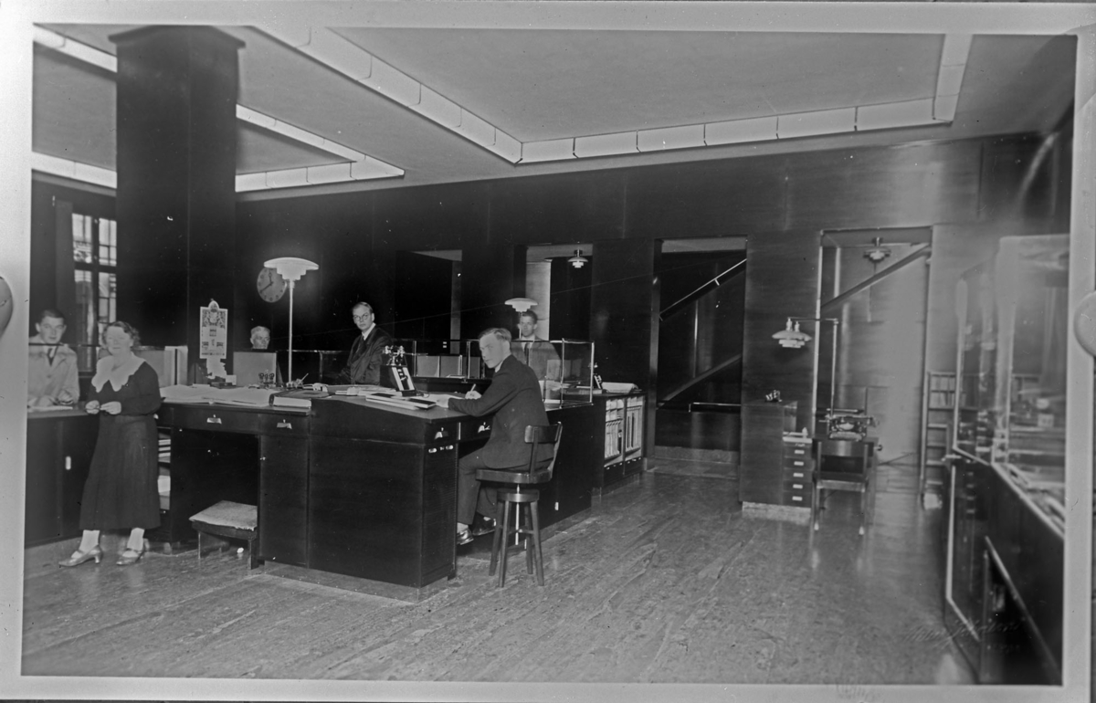 Stadsbanken. Repro av bankinteriör med sex ur personal.