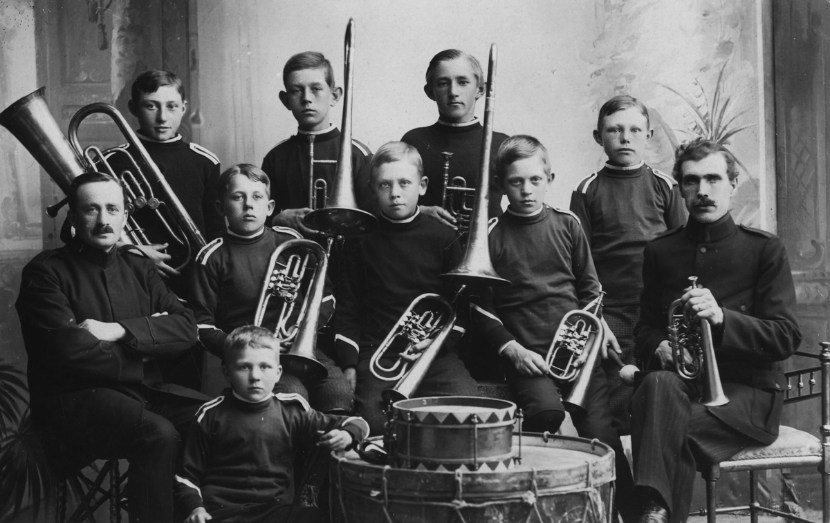 Blåsorkester överst (4st) Gummiarbetare Ragnar Vadman, cykelfabrikör Gunnar Haldén, Korrespondent Gunnar Joansson? Elektriker Einar Hansson, mellersta raden (5st) Johan Dalgren, Verner Karlsson, jernvaru? Tage Lundqvist, skomakare Verner Halldén, cykelhandlare Carl Sjölander, nederst snickaren Nils Jeppson.