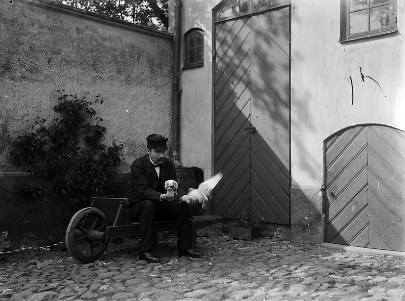 Äldre man som sitter på en gårdsplan och matar duvor, Johnssons privata bilder