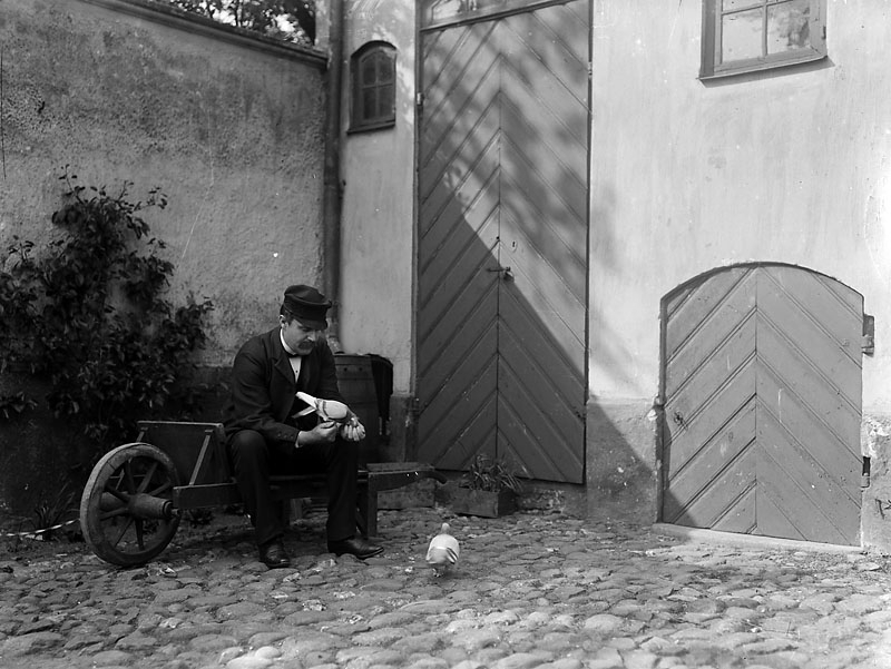 Äldre man som sitter på en gårdsplan och matar duvor, Johnssons privata bilder