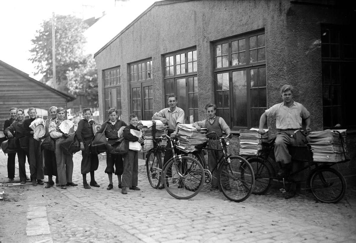 Gatubilder. 11 gossar med tjocka packar med tidningar.