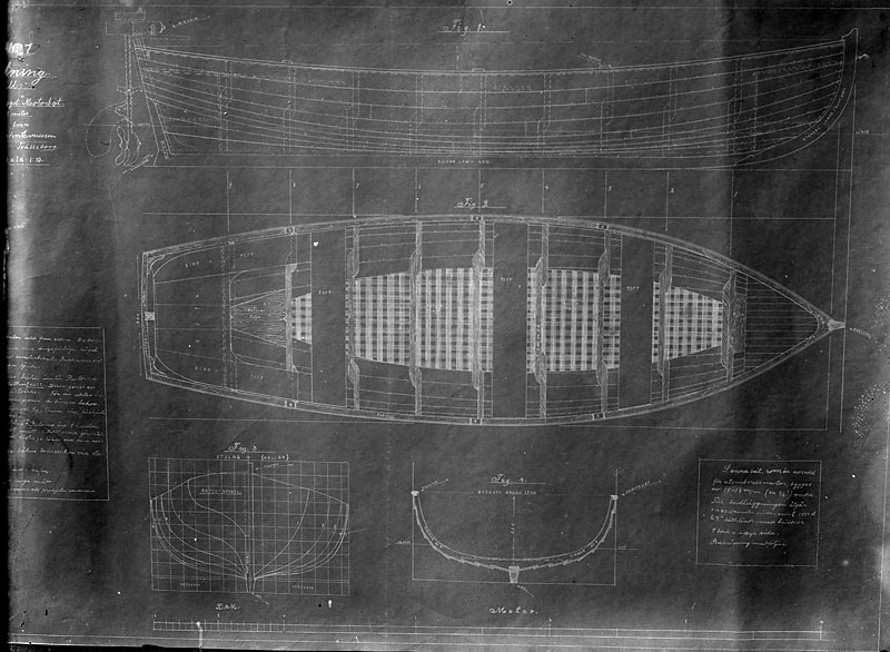 Ritning på en båt med utombordsmotor, vy 1917 B på asken