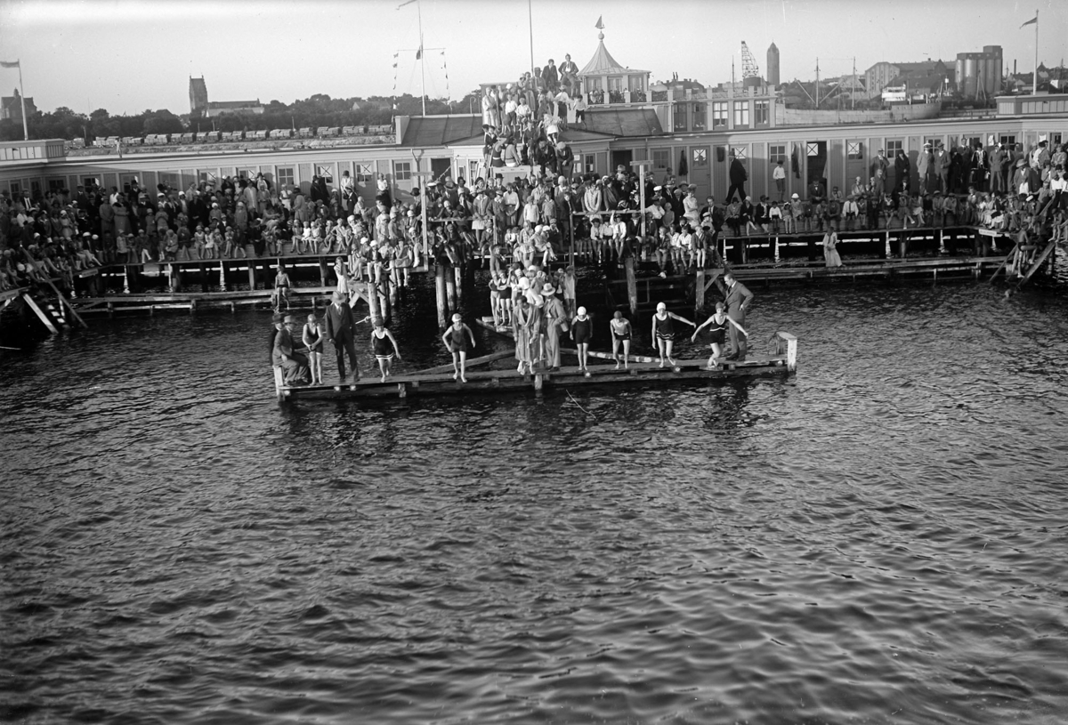 Gatubilder. Kallbadet sett från vattnet, simuppvisningen.