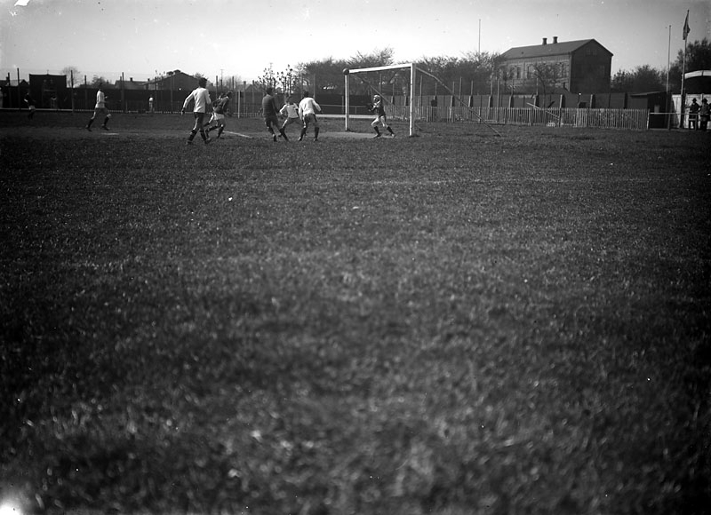 Pojkar spelar fotboll på idrottsplatsen, vy 1920 på asken