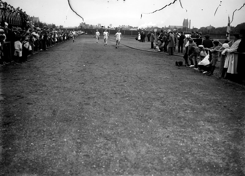 Löptävling eventuellt på idrottsplatsen, vy 1920 på asken