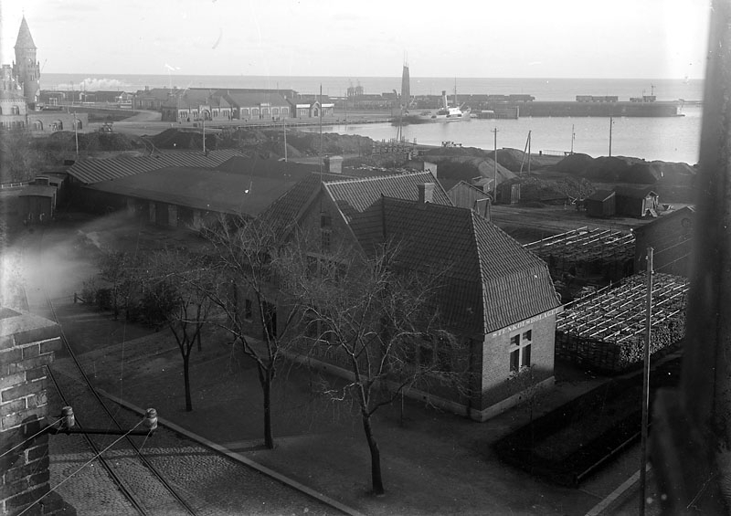 Stadsvy von oben Stenkolsbolaget i förgrunden, hamnen i bakgrunden, vy 1917 F på asken.