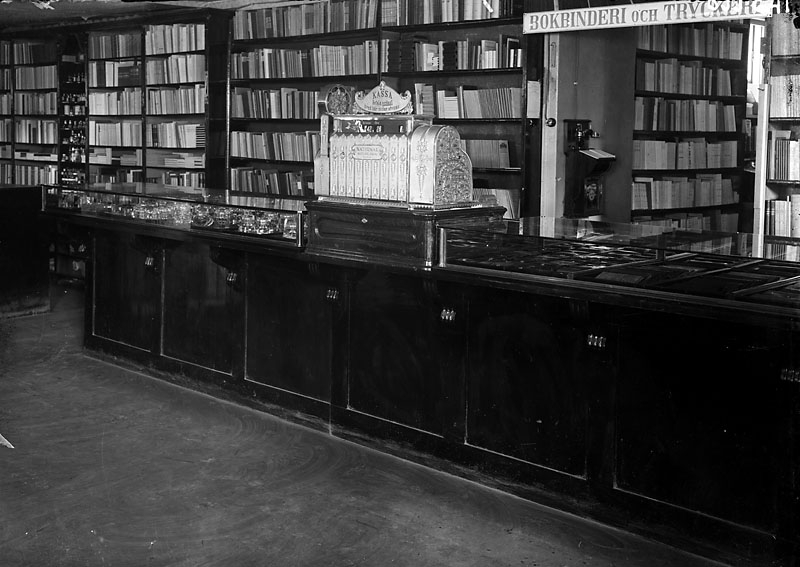 Interiör eventuellt Lundgrens bokhandel Östergatan Öster Vallgatan vy 1917 J på asken