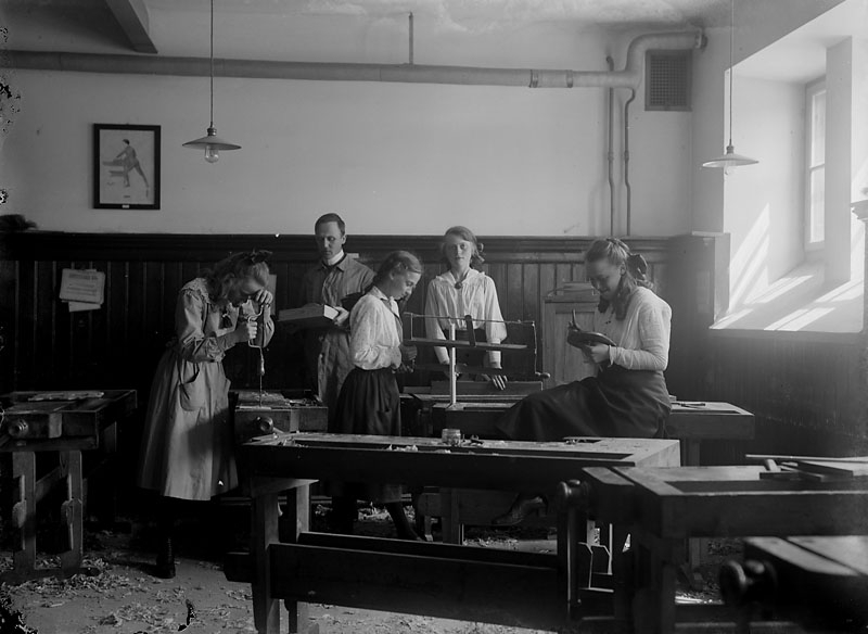 Fyra flickor som har träslöjd vy 1917 J på asken