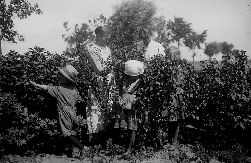 Två kvinnor och tre barn i en trädgård. Johnsons privata bilder.