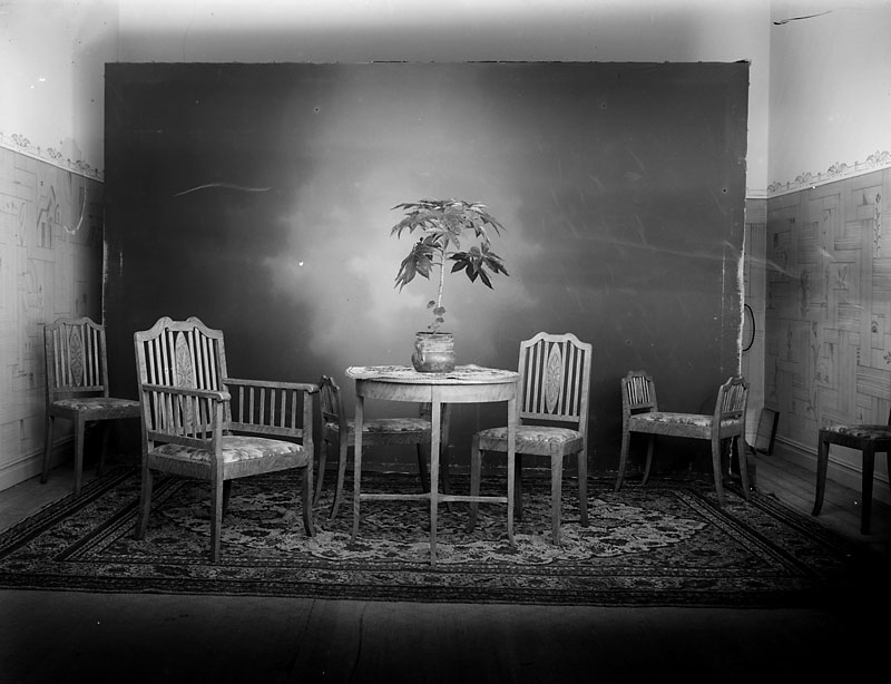 Ateljébild, möbelgrupp, bord, stolar och pallar. Johnsons privata bilder.