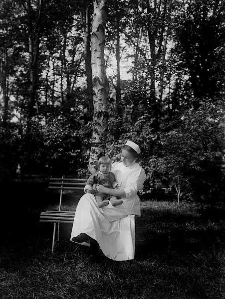 Dam med sjukvårdsuniform sitter med barn i knäet på parkbänk 1919