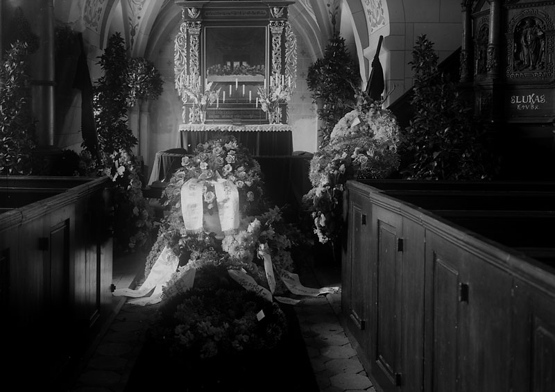 Kista med blomsterbår i kyrka