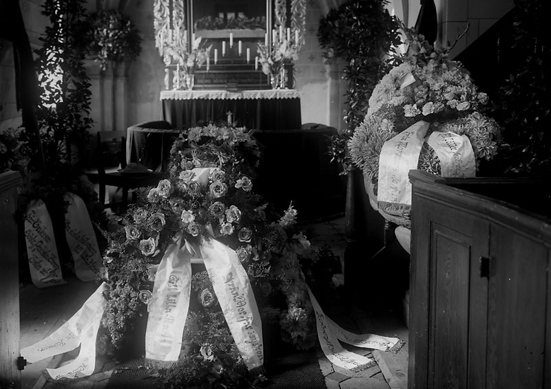Kista med blomsterbår i kyrka