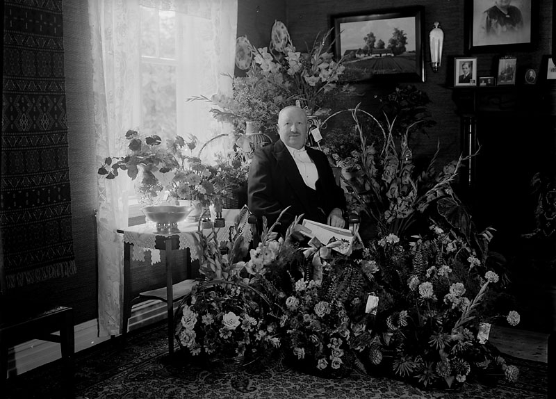 Man poserar bland blomsteruppsättningar, (födelsedag?) i rumsinteriör Åkare Kristersson.