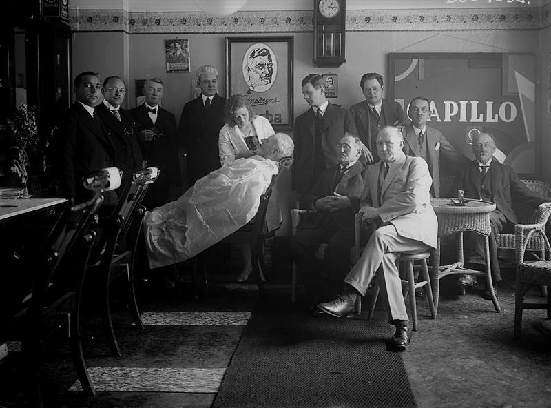Gruppbild i raksalong kund i rakstolen som rakas Larssons rakstuga